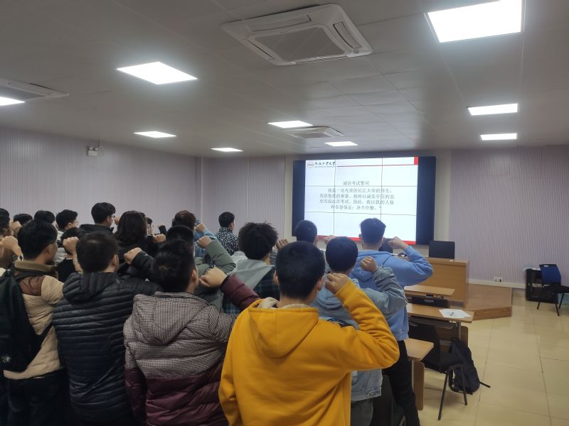 学生管理手册》为抓手,通过对本校近期发生的真实案例分析说明考试作弊行为种类及相应的纪律处分,阐明考风考纪的严肃性与重要性。教育活动临近尾声,全体进行了具有仪式感的诚信宣誓。
