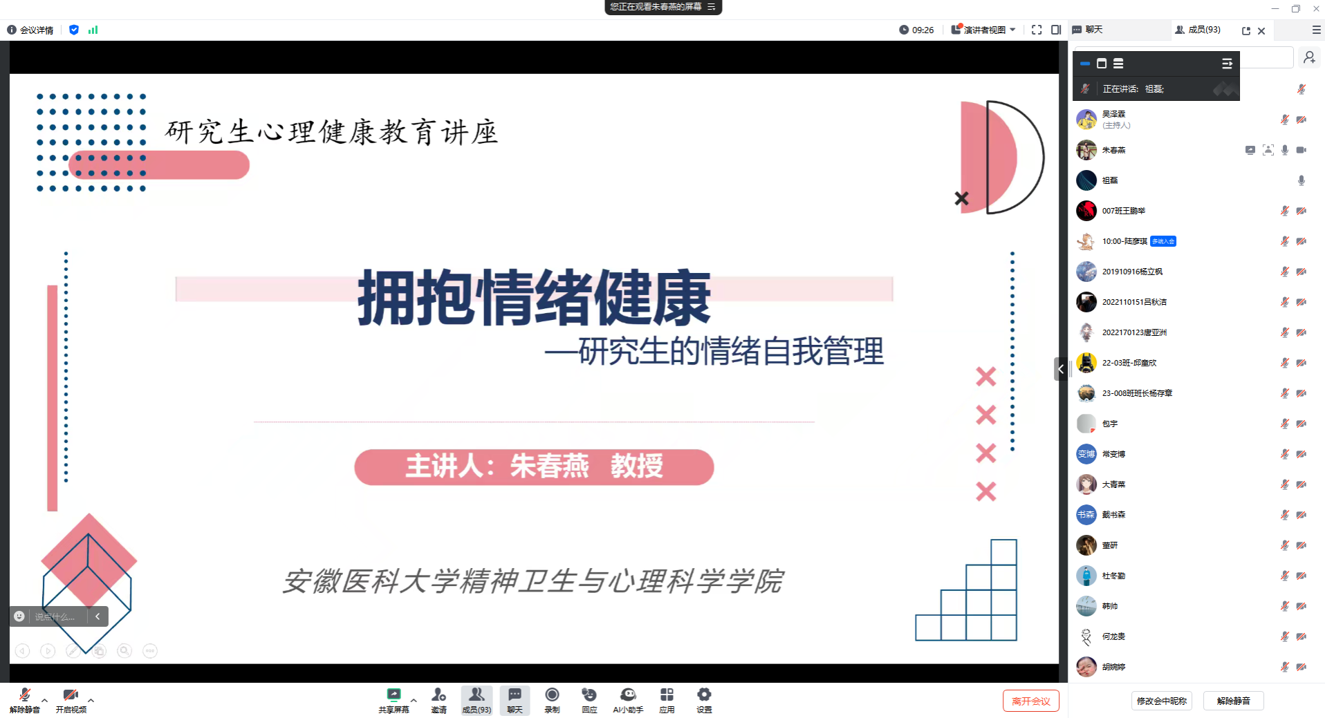 线上举办了“拥抱情绪健康---研究生的情绪自我管理”主题报告会。本次报告邀请了安徽医科大学精神卫生与心理科学学院院长朱春燕教授担任主讲人,报告会由麻豆