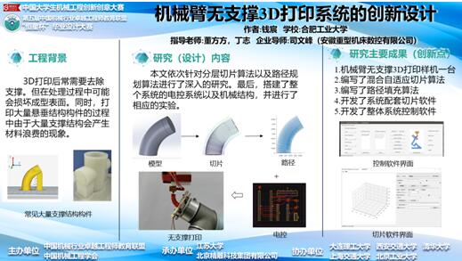 钱宸同学的参赛作品《机械臂无支撑3D打印系统设计》,来源于2019年国家级大学生创新创业项目,依次设计了混合切片算法与路径规划算法,搭建了整体系统并进行了实物打印,验证了通过机械臂托台式的结构完成无支撑的3D打印模式的可行性。刘潇翔同学的作品《履足式复合机器人整体设计及控制开发》,提出了一种基于物联网的多地形适应的四足履带可变形复合式机器人的设计方案,能够在四足机器人与履带车两种形态之间进行快速切换,具有非常高的灵活度与环境适应能力。