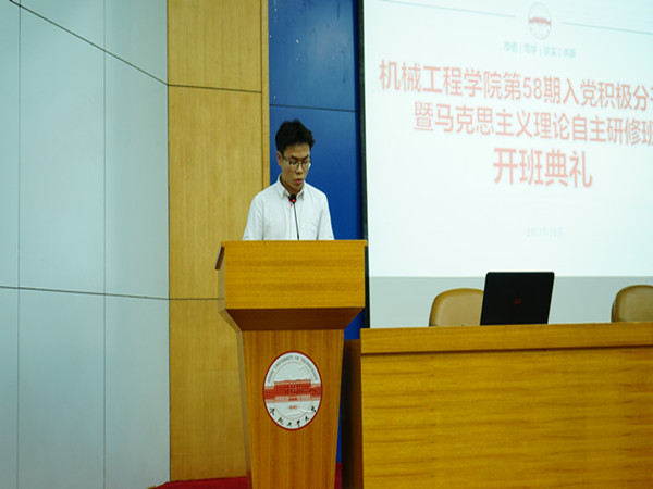 开班典礼由学院党委副书记、副院长郑召丽主持。研修班班主任刘洋布置了本期学员班的研修学习计划,对学习纪律和考核评价提出了具体要求。学员代表机械设计制造及其自动化2016-1班徐宸阳同学作了发言。随后,院党委书记韩江向全体学员提出三点希望和要求:一是希望同学们充分利用自主研修的重要载体,做马克思主义的坚定信仰者和忠实实践者,树牢坚定不移跟党走的信念和信心;二是希望同学们自觉担当使命,坚定走中国特色社会主义道路的理想信念;三是希望同学们刻苦学习,练就过硬本领,做新时代的有志有为青年。