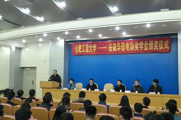 第一届“合肥工大-安徽华信电动奖学金”颁奖仪式在屯溪路校区格物楼214报告厅举行。出席仪式的嘉宾有安徽华信电动科技股份有限公司董事长杨善春、安徽华信电动副总彭勇成、安徽华信电动总工程师范杰、安徽华信电动总经理助理张超,麻豆