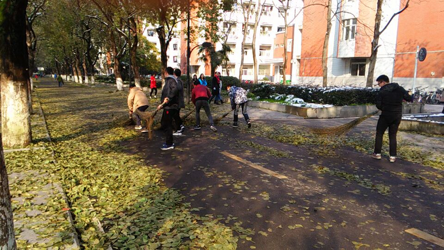 组织本科生党员和学生志愿者共100余人利用课余时间分赴校园落叶堆积路段,协助物业公司开展清扫活动。