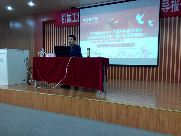 于机械楼214邀请校十八届六中全会精神宣讲团成员、校党委统战部部长姚跃传做了题为《学习贯彻十八届六中全会精神、为实现中华民族伟大复兴的中国梦而努力奋斗》的报告。本次报告会由麻豆