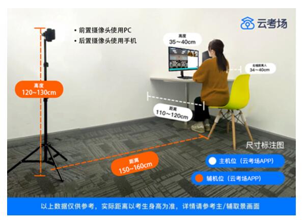 5、设备摆放要求:网络远程面试主设备,需要正向面对考生,复试全程开启,摄像头正对考生。复试过程中,要求视频中考生双手和头部全程在视频录像范围。网络远程面试监考及备用设备,摆放在考生侧后方(与考生后背面成45°角),能够全程拍摄考生本人和电脑屏幕,复试全程开启。