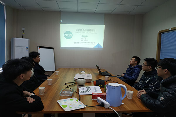 带队老师田崇浩向公司介绍了学院近年来的发展情况及应届生就业情况。公司技术部部长、2011届校友董成为我校师生详细介绍了公司过去的运营机制及发展状况。目前公司已圆满完成第一个生存下来的五年计划,进入飞速发展期,今年实现了从4000万到1亿元的突破。后续将进一步加大和学校的合作,增进校友间的联系。随后,董成校友带领我校师生参观了工厂车间并对随行的四位应届生进行了面试。