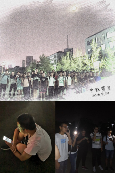 晚上八点整,室外互动环节,同学们共同开展了夜中秋·千里赏月大会,在风雨操场上,工业工程1班的同学们围坐成一圈,吃着月饼、欣赏月光、表演节目;丽人湖边,“水中映月,廊下有灯,桥上人影”,画面唯美,同学们欢声笑语,和着微风,在丽人湖上荡起微波,歌声乐声欢笑声充斥着整个校园,使得今年的中秋佳节为校园增添了别有风味的祥和气氛。