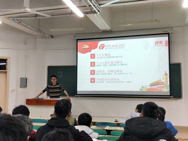 辅导中,2017级辅导员张帆和刘洋深入各班级,带领学生原原本本、原汁原味学习好党的十九大精神,强化使命担当,振奋精神状态,积极投身建设实践。同时结合党的十八大以来经济社会取得的巨大成就和历史性变革,着重从“三个意味着”和“五个是”解读“新时代”的科学内涵和时代昭示,进而引导学生把握“新要求”“新使命”。接着从“八个明确”和新时代坚持和发展中国特色社会主义的十四条基本方略等角度,全面阐释习近平新时代中国特色社会主义思想的丰富内涵。引导学生坚持用这一马克思主义中国化最新成果作为思想武器和行动指南,深刻认识这一重大思想的历史地位、丰富内涵、精神实质和实践要求,切实增强“四个自信”。结合决胜全面建成小康社会、开启全面建设社会主义现代化国家新征程的“两步走”战略,引导学生树立强烈的新时代主人翁意识和责任感,以时不我待、只争朝夕的精神投身学习和实践,不断提高社会责任感、创新精神和实践能力。
