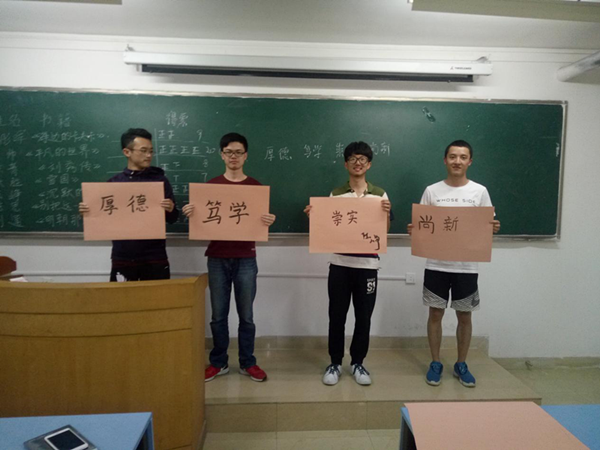 “读书会”正式开始后,阅读会期间,同学们自行选择课外读物,静下心阅读,享受读书的过程。朗读会期间,同学们自愿上台,朗读自己喜欢的作品的片段或者向大家推荐优秀读本,民主评选出的前三名,获得“班级读书之星”称号,赠予经典读物。王帅同学声情并茂地朗读《平凡的世界》片段,深深地打动了在场的同学们,当之无愧的获得“班级读书之星”称号。书法秀开始,喜爱书法的同学踊跃参加并题写“厚德、笃学、崇实、尚新”八字校训。