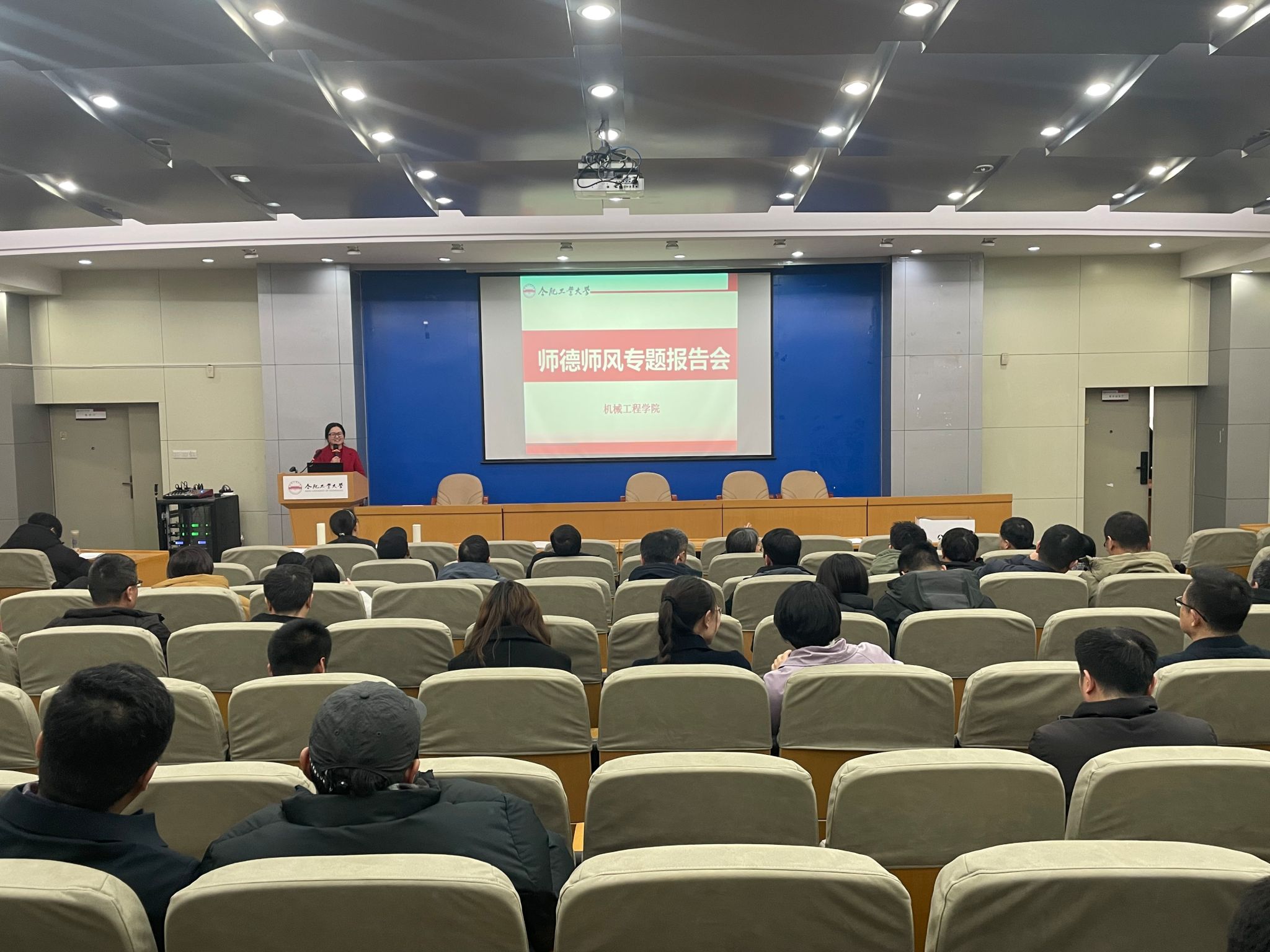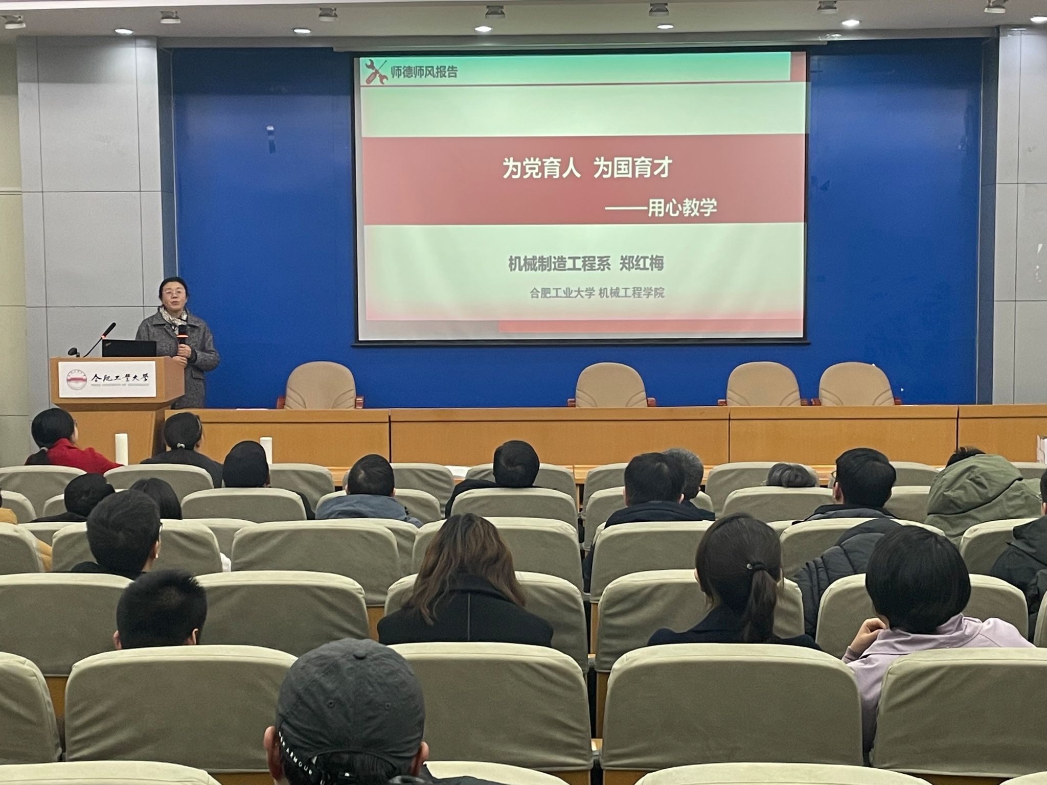 举办的2025年第一场师德师风专题报告会在格物楼214报告厅圆满落下帷幕。此次报告会特邀“安徽省优秀教师”郑红梅教授主讲,全院教师参加学习活动。会议由学院党委副书记兼纪委书记蔡伟伟主持。